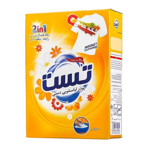 پودر لباسشویی دستی تست ۵۰۰ گرمی یک محصول ایرانی است که توسط شرکت صنایع شوینده تست تولید و به بازار عرضه میشود. این پودر برای شستشوی دستی انواع لباسها مناسب است و دارای رایحه گلهای بهاری است.